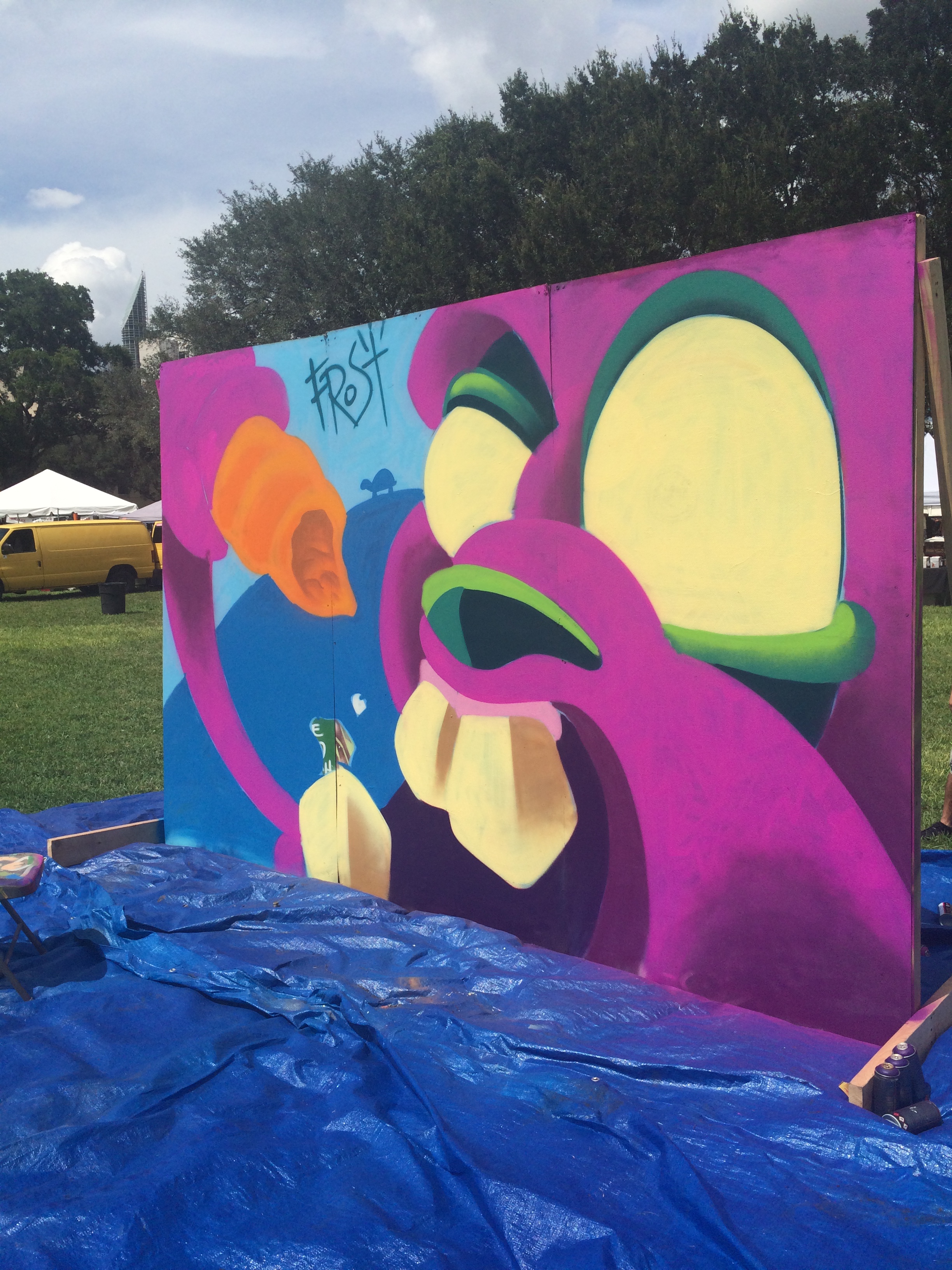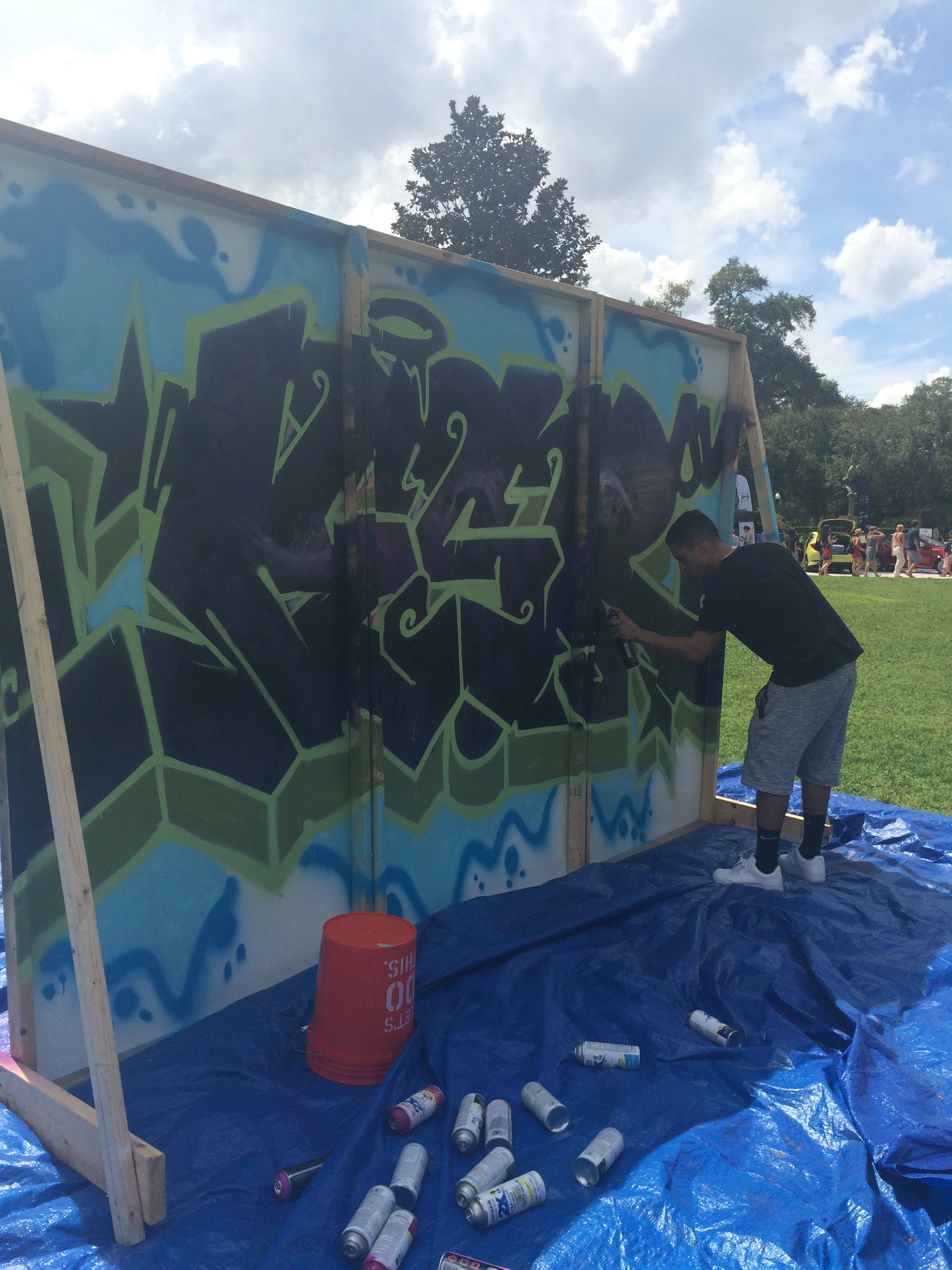 I got to attend the event VIP style. Thanks to the Orlando Weekly I won a VIP ticket to Artlando when I attended Tasty Tuesday’s in the Milk District. I was super stoked! Saturday was a scorcher and if you had VIP, you got to sit underneath a shaded tent, you received 14 drink tickets (lots of soda and water for me, Yay!), and a complimentary T-shirt. The other cool thing about having VIP is that you get to meet perfectly awesome strangers. One gentleman I met works with graduate students in the Health Communications field. Another gentleman I met is a veteran and does YouTube videos to help people relax. His friend that he was with is a former makeup artist and works for Ripley’s Believe It or Not, one of the most curious’ places in America. Conversation with these two was refreshing, inspiring, and enlightening. Needless to say, I had a blast.